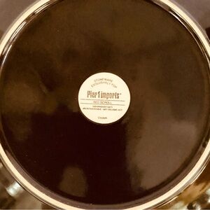Pier 1 Imports stoneware dinner plate with a red scroll pattern and a tan center.