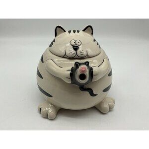 * Pier 1 Imports Teapot Chubby Black & White Striped Cat Holding a Mouse as Spout