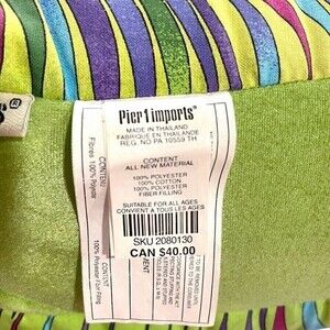 The cat pillow is branded by Pier 1 and was made in Thailand. It is suitable for all age groups, from infants to adults. Ideal for cat-themed decor enthusiasts.