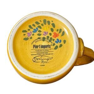 This handcrafted Pier 1 imports mug features a beautiful Tuscan floral pattern on earthenware material. The colorful design is hand-painted, making each mug unique. It is an original, licensed reproduction from Pier 1 Imports and is microwave and dishwasher safe. This mug is perfect for collectors and those who appreciate handcrafted decor