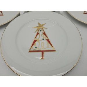 Add some festive cheer to your holiday table setting with this set of Pier 1 Christmas Tree porcelain salad and dessert plates. The plates feature a beautiful red and gold design, perfect for your Christmas gathering. Measuring 7.5 inches in diameter, these round plates are ideal for serving your favorite desserts or salads.