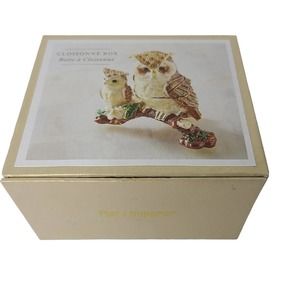 Pier 1 Owl with Baby Figurine Cloisonné Rhinestone Trinket Box Jewelry Holder. Metal and Enamel Cloisonne. Base Opens to Hold Jewelry or Other Small Treasures. Great for the Owl Collector. Approx Measurment's 2.48"W x 1.69" D x 2.56H. Box Included. Good Pre-Owned Condition. Owls in Great Shape. Box Shows Light Wear. See Pics for Details. Smoke Free Environment. All Reasonable Offers will be Considered.