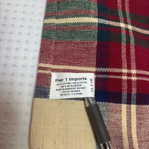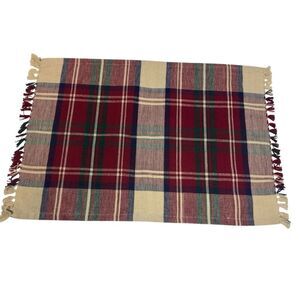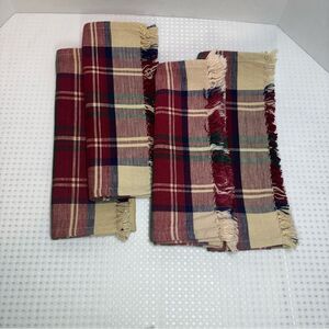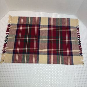 Charming, rustic plaid fringed placemats to add a touch of warmth to your table. Features red, green, and cream colors.