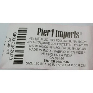 Up for Consideration is a Brand New Pier 1 Red Green Sheer Napkins Set of 4 with Red Green Jingle Bells. Each Meaures 20" x 20", Dry Clean Only, 43% Metallic, 39% Polyester, 18% Nylon.  Photos are of the actual items and also part of Description.