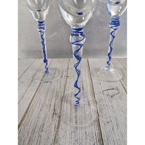 Pier 1 Set of 3 Wine Champagne Glasses 9 1/4" Tall Blue Ribbon Stem