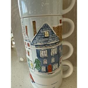 Pier 1 Stacking Festive Holiday Mugs Winter Scene Christmas Village Stoneware