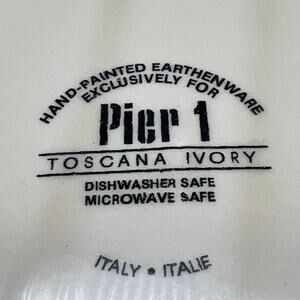 The Pier 1 Toscana Ivory Pasta bowls, a set of 2, are a stunning blend of classic design and artisanal craftsmanship. Made in Italy, these large bowls feature an elegant ivory finish that complements a variety of table settings. Their timeless appeal makes them perfect for enjoying your choice of pasta from it daily, or other foods in style. As a discontinued design, these bowls are a rare find and ideal for collectors or fans of Pier 1’s quality stoneware. Durable and versatile, they bring sophistication to everyday use or special occasions.