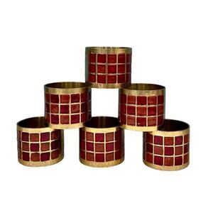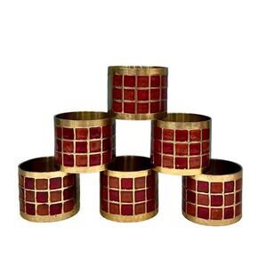 Pier 1 Vintage Brass with Red Enamel Napkin Rings Holder Set of 6 Geometric 80’s