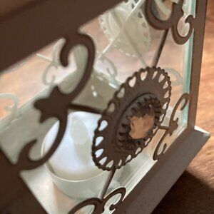 Pier 1 White Jeweled Mini Lantern, 8.5” H x 3.5” W. Birdcage style. Like new. Decorative. Hanging or standing. Holds a standard tea light or tea light LED.