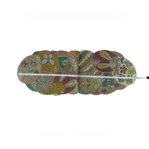 This Pier 1 Easter beaded table runner is an elegant and festive piece featuring a detailed beadwork design with a spring-inspired theme. The runner is composed of overlapping Easter egg shapes, each adorned with intricate floral, leaf, and butterfly patterns. The color palette includes soft pastel shades such as gold, green, teal, pink, and mauve, giving it a vintage yet vibrant appearance.