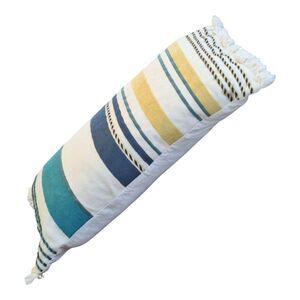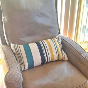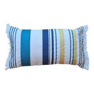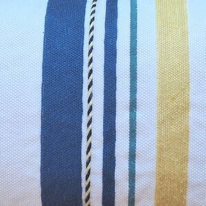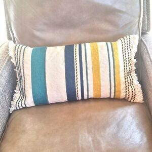 Stripe Lumbar pillow from Pier 1 in winter white, gold, blue and teal woven cotton with twisted embroidered stripes