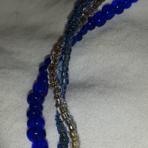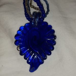 Beautiful painted leaf shaped pendant on a triple strand beaded necklace. Cobalt blue, silver & Williamsburg blue. Pendant has cobalt blue, aqua, silver gold & chestnut.