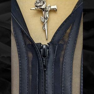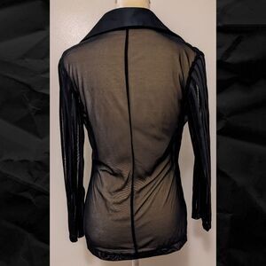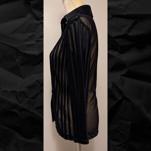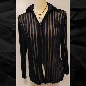 PAG Striped Mesh top - EUC - Sumptuous matte satin and mesh top. Zip front. Sheer back with striped front and sleeves. Classic collar adds a tailored touch. Very stretchy. No size or content tag. Most likely polyester, nylon and spandex. Clings in all the right places.