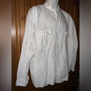 Vintage 90’s preacher collar long sleeve button up. Recently washed to remove a good amount of yellowish “ring around the collar”stains