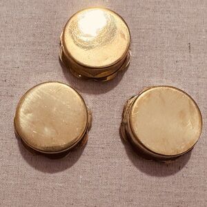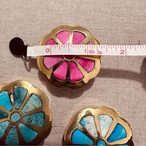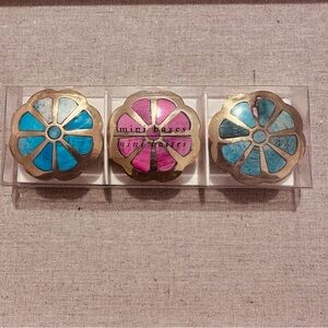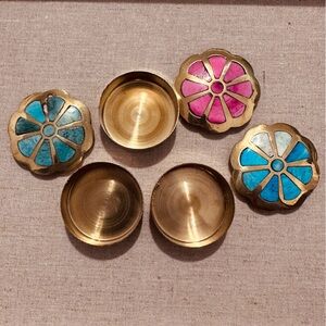 • Three brass mini boxes with floral design inlays.