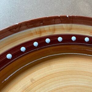 Brown and orange large circular serving dish with white dots along the boarder, there is also one random dot in part of the center, because this is hand painted. There are some chips in the paint on the sides of the dish, and some chips on the bottom. They are shown in photos, and the dish is still in good condition!
