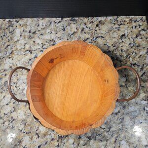 This is a solid wood bowl stained orange that's shaped like a pumpkin. Has two brown metal handles. And next to each handle, brown metal pumpkin leaves. Sold by Pier One. The wood is ribbed like a pumpkin and has natural wood grain knots and few tiny natural wood cracks. These wood characteristics give this bowl lots of character. This bowl is centerpiece size perfect for placing on the middle of a table, shelf etc. measures 9 3/4 inch in diameter 11 1/2 inch counting the handles and 4 3/4 inch deep. Perfect fall harvest wood accent bowl to fill with real or artificial harvest good. In nice condition preowned. Non smoking pet free home. @ BR #3