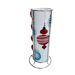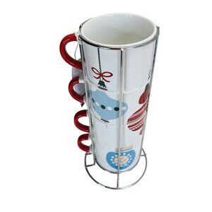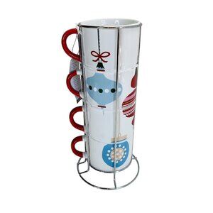 Pier One Stacking Mug Set on Stand Christmas Ornaments Red Handles Stoneware