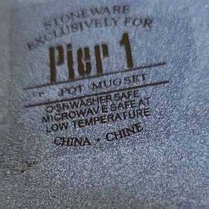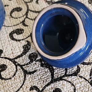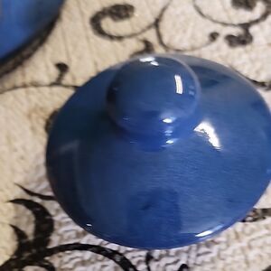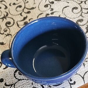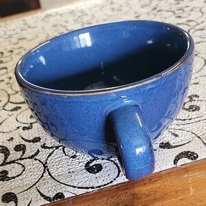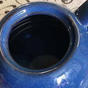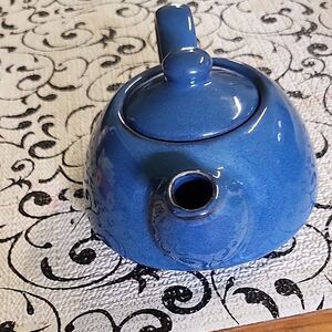 Elegant blue stoneware teapot with matching cup. Perfect for tea lovers. Microwave safe at low temperatures. Stackable for storage when space is limited.
