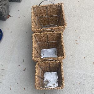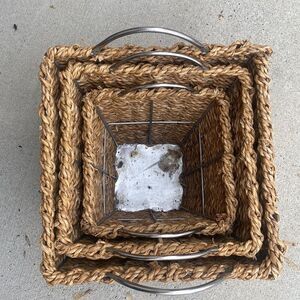 3 banana leaf weaved square baskets with silver handles in VGUC. Great for storage or styling.