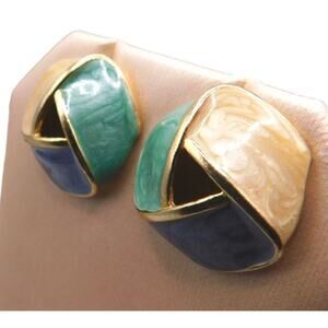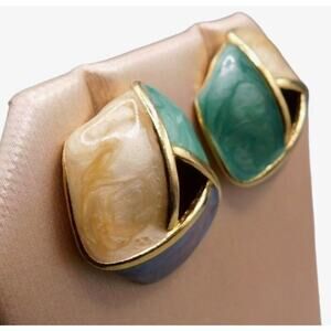 Pierced Earrings Retro Teal Green Blue Beige Enamel Geometric Shaped Gold Tone.