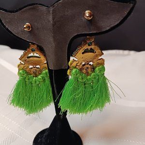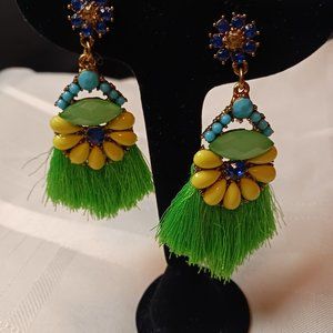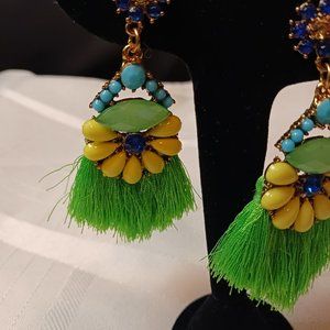 Wow what stunning earrings! Green tassels hang from a Yellow with Blue centered flower. They measure 3" from post to end of earring. They have never been worn,