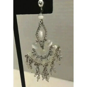 Pierced Silver Tone White Iridescent Beaded Chandelier Dangle Earrings Boho
