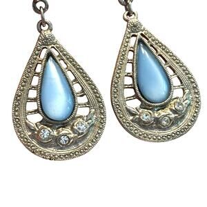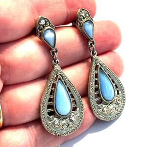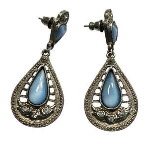 Vintage inspired pierced earrings done in a drop & dangle style - these are silvertone metal teardrops set with opaque blue moonstones and tiny sparkling rhinestones. Dramatic and very pretty. No hallmarks but nice quality fashion jewelry. In good condition - no apparent damage or flaws - nice!