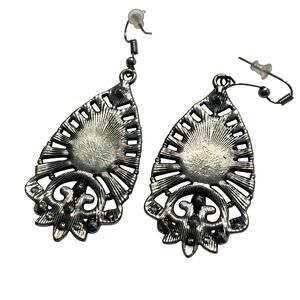 Pierced earrings ornate Silvertone teardrops green moonstone centers drop dangle