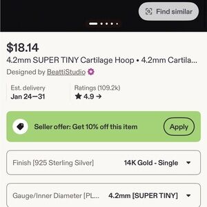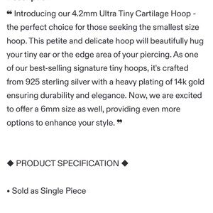 tiny 14k gold plated sterling silver clicker hoop. Inner diameter 4.2mm. I never even tried it on, I mis-measured what inner diameter I’d need. Etsy shop from Canada, beautiful craftsmanship!