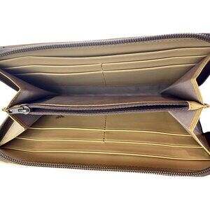 Exterior: Coated canvas-style material with contrasting tan leather piping and leather zipper pull, gold-tone zip-around closure.