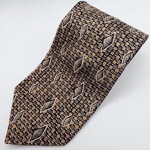 This is a Pierre Balmain designer tie in a gold geometric pattern made of silk. It has a classic length and width, and was crafted in the United States. The tie is in like-new condition.