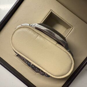 Stylish square watch with a black face. Silver Roman numerals and date feature. Classic metal bracelet.