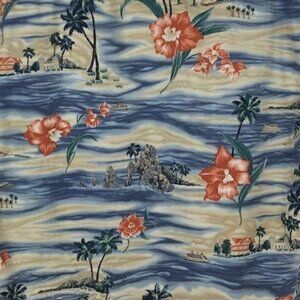 Step into tropical style with this vintage Pierre Cardin men’s Hawaiian shirt in size XL. Made from 100% cotton and crafted in Korea, this lightweight button-up features a classic island print with bold coral hibiscus flowers, palm trees, and ocean waves in shades of blue, tan, and cream. The relaxed fit, short sleeves, and camp collar make it ideal for summer getaways, beach parties, or vacation lounging. This timeless resort shirt combines comfort and retro vibes—perfect for casual wear or collecting vintage designer pieces.