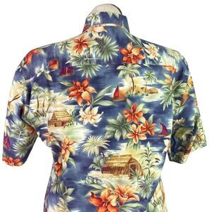 Pierre Cardin Hawaiian Camp Shirt Men M Blue Floral Island Palms Button Up Short Sleeve VTG