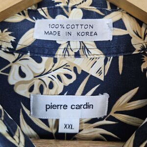 Nice tropical print on this Pierre Cardin Hawaiian-style short sleeve shirt. The print has sailboats, palm trees, monstera leaves, and hibiscus. The shirt is made of 100% cotton and the tag size is XXL.