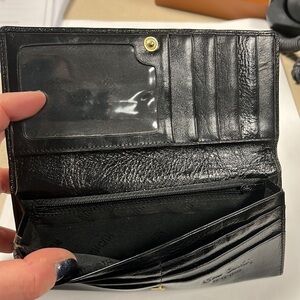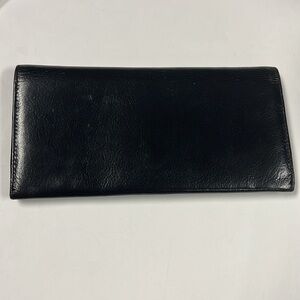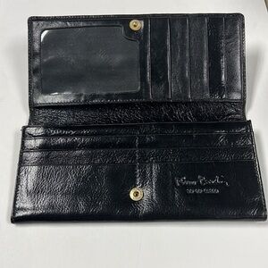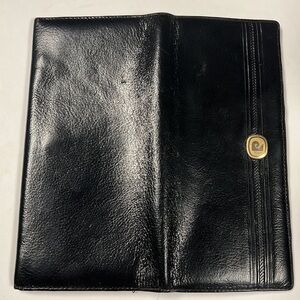 This is a great vintage Pierre Cardin Long Leather Wallet. Snaps open to 10 credit card slots, ID window, 2 slip in long compartments and a zipper compartment. No odors. Minor scuffs. The lining at the very interior bottom is coming a bit loose, but not a huge issue. 7.25” x 3.5”