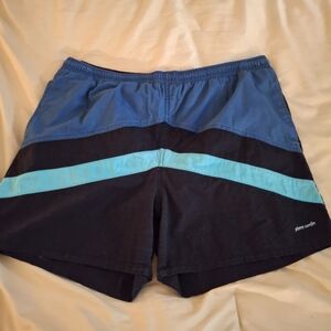 Dive into style with these Pierre Cardin men's swim shorts. Featuring a striking blue chevron design, these shorts are perfect for any beach or pool day. Has inner lining with two front pockets and elastized waist with tie front. Size Large. waist size to side measures 17 inches with stretch. Length 17 inches. Inseam 4 inches.