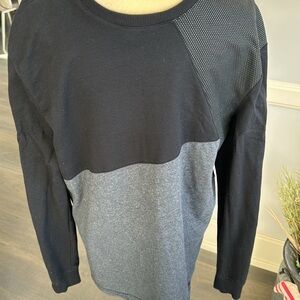 Black and gray two tone Lightweight Men’s Sweater. Inside tag says XL but it is more like Medium for US Mens Size. Main fabric is 100%Cotton Yarn Count. 15% Polyester dotted on the right upper shoulder.
