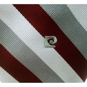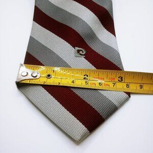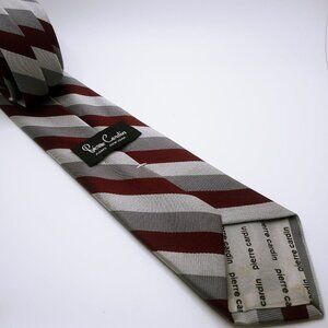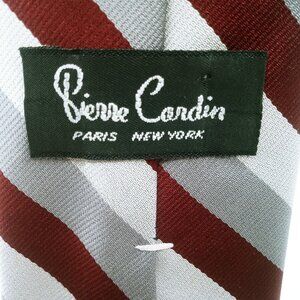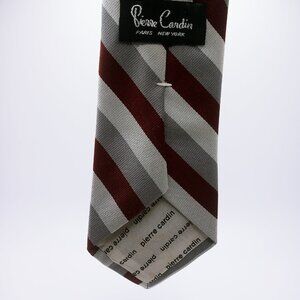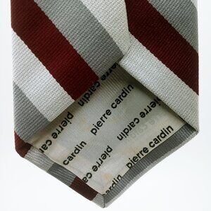 Pre-owned: Pierre Cardin Paris New York Men's Tie is a burgundy and gray striped tie made of polyester material. It has an embroidered logo and is adjustable. The tie is 60 inches long and 3.25 inches wide with a pointed style. It is a classic length tie and is perfect for men's formal wear.