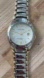 Description: Vintage watch. Large silver dial with date window. Gold-tone hands and markers. Two-tone stainless steel bracelet. Just cleaned and serviced with a new battery installed. Works well!