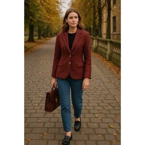 Think crisp leaves, old libraries, and Ivy League charm — this vintage 1990s Pierre Cardin blazer is all equestrian prep and timeless academia. Crafted in wine-colored 100% wool, fully lined in vibrant raspberry satin, and finished with antique gold horse-motif buttons, it’s the kind of jacket that makes fall feel cinematic.