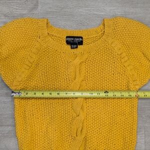 Chic Pierre Cardin sweater in a rich mustard hue. Features a stylish cable knit design. Perfect for cozy elegance.
