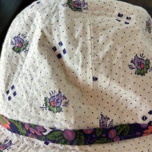 Handmade Pierre Deux Size 2 Cloth Sun Hat with Purple Flowers and a colorful hat band.