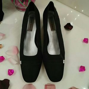 🎩 Pierre Dumas 10 sz block heels rhinestones black satin shoes for party holiday