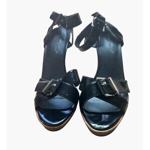 Dance the night away in these black patent leather high heel sandals feature a chic design with durable ankle straps and stylish buckle accents. Ideal for evening wear or formal occasions, they offer both style and comfort. The stiletto heel adds height and elegance, making them a versatile addition to any wardrobe. Size 9 SKU 3428