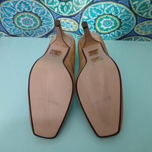 These elegant gold heels by Pierre Dumas feature a classic stiletto design, perfect for adding a touch of glamour to any formal occasion. The shoes are adorned with a decorative embellishment on the toe, enhancing their sophisticated appeal. With a comfortable heel height, they are ideal for both style and comfort.