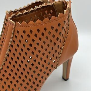 Pierre Dumas Lattice Suede Tan Ankle Heel with Peep Toe 7.5 B69