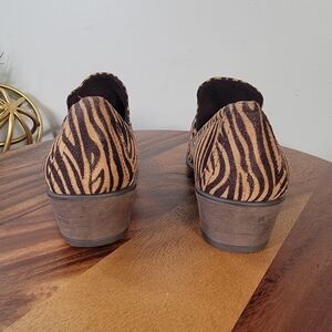Brown animal print faux suede loafers style low top ankle boots. Versatile western influenced shooties.