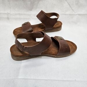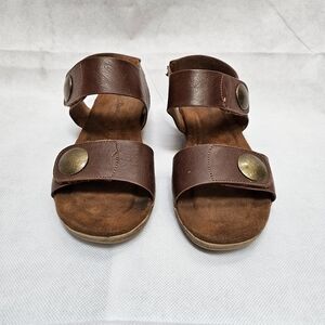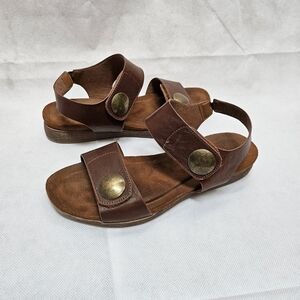 Cushioned footbed sandals with oversized brass metal button accents. Velcro Closure over foot and ankle for perfect fit. Size 7.5